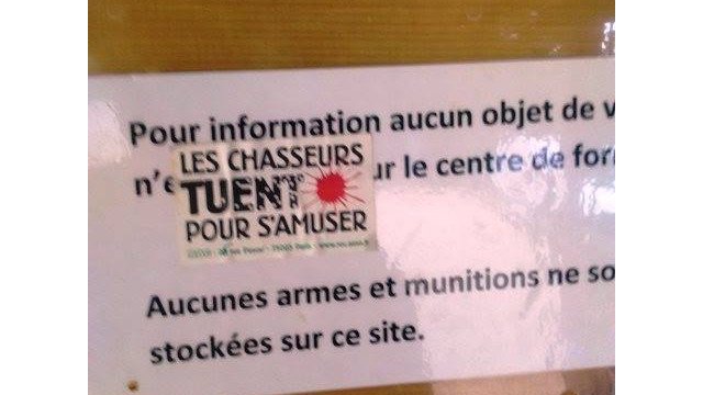 Mardi 15 mai, le centre de formation et d’examen du permis de chasser de la fédération départementale des chasseurs de l’Isère a été vandalisé : goudron sur la porte d’entrée du chalet et sticker anti-chasse apposé sur la devanture.