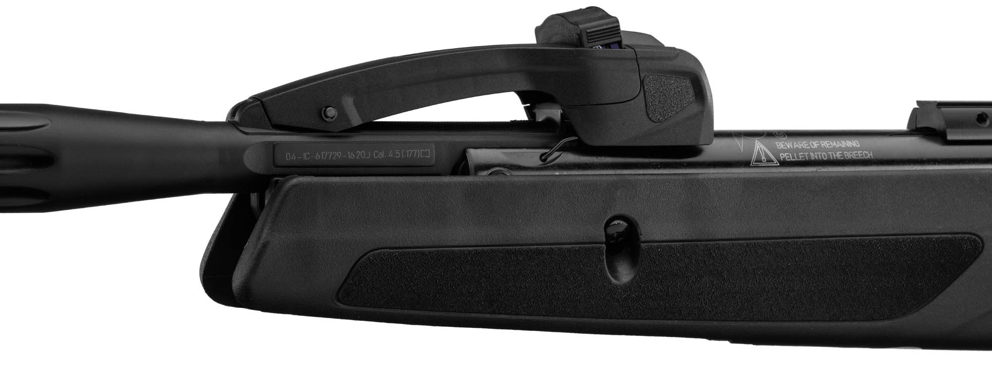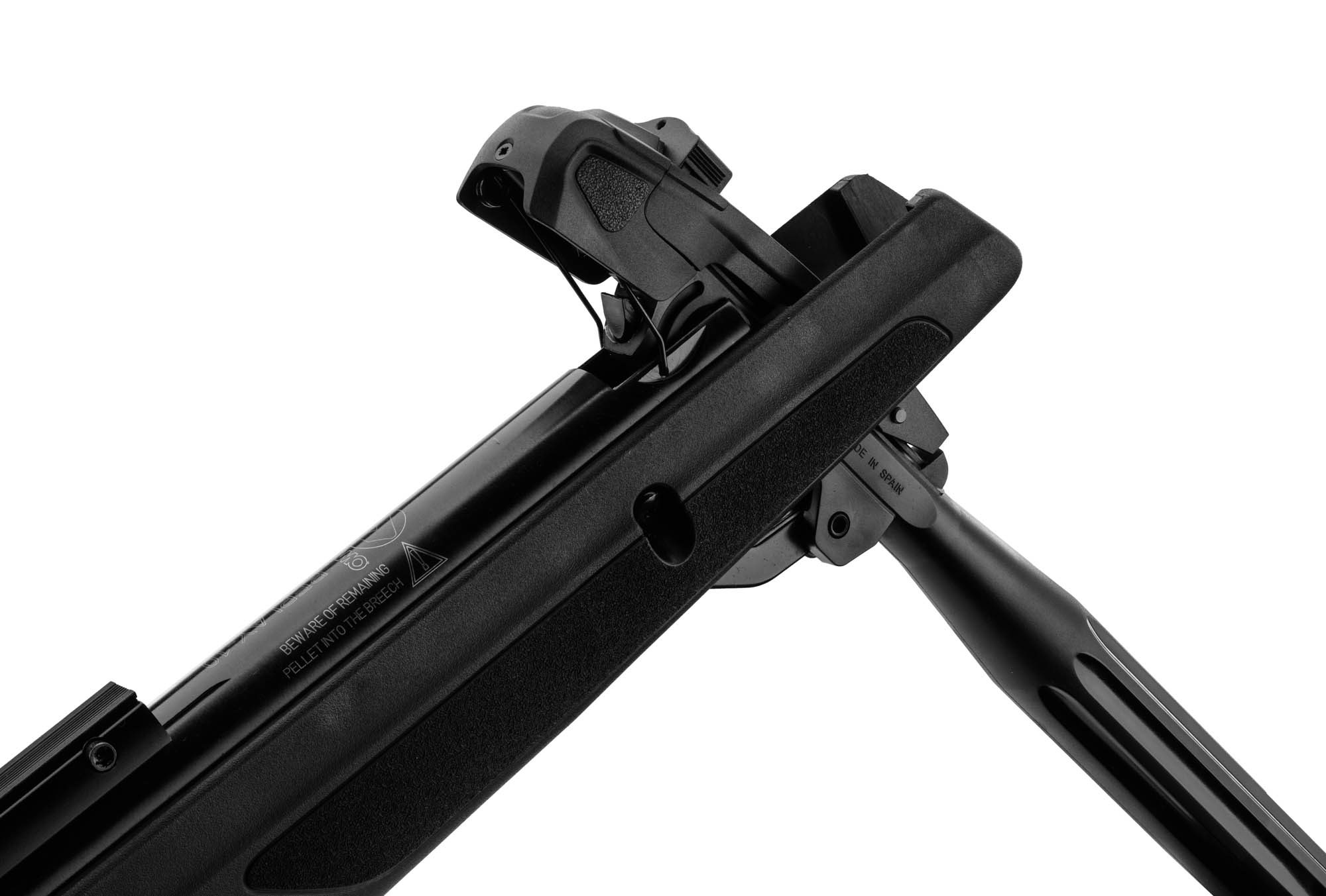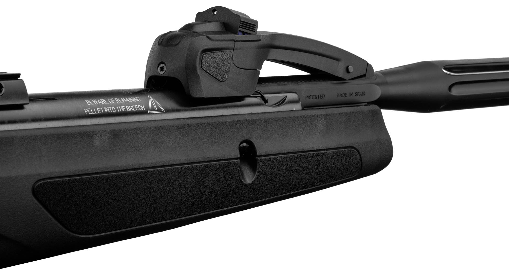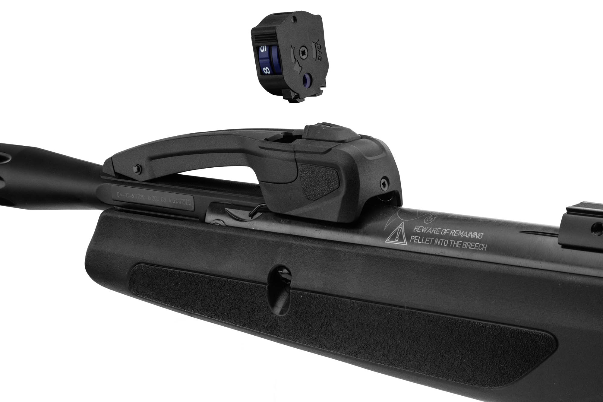 Cette carabine à air comprimé permet de mettre 10 coups dans un chargeur. Mais au lieu de recharger avec une barre sur le dessous ou latérale à la carabine. Il suffit de basculer le canon pour la recharger. Ce système de rechargement à bascule s’appelle Breack barrel.