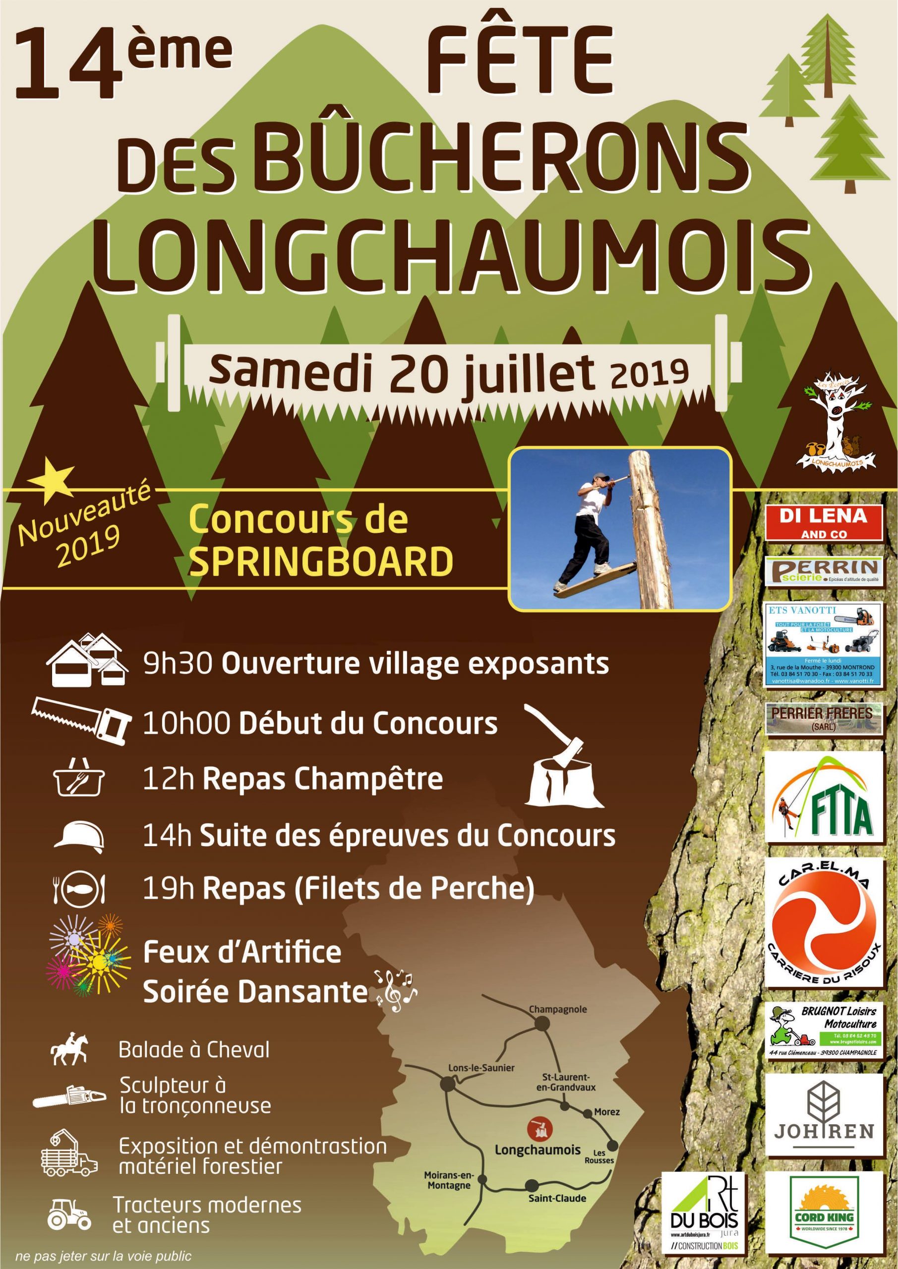 28 concurrents se départageront durant trois épreuves de bûcheronnage, 3 accèderont à la finale avec l’abattage à la hache. Première fois cette année un concours annexe au concours principal avec le springboard épreuve existante aux championnats du monde. Impressionnante épreuve !