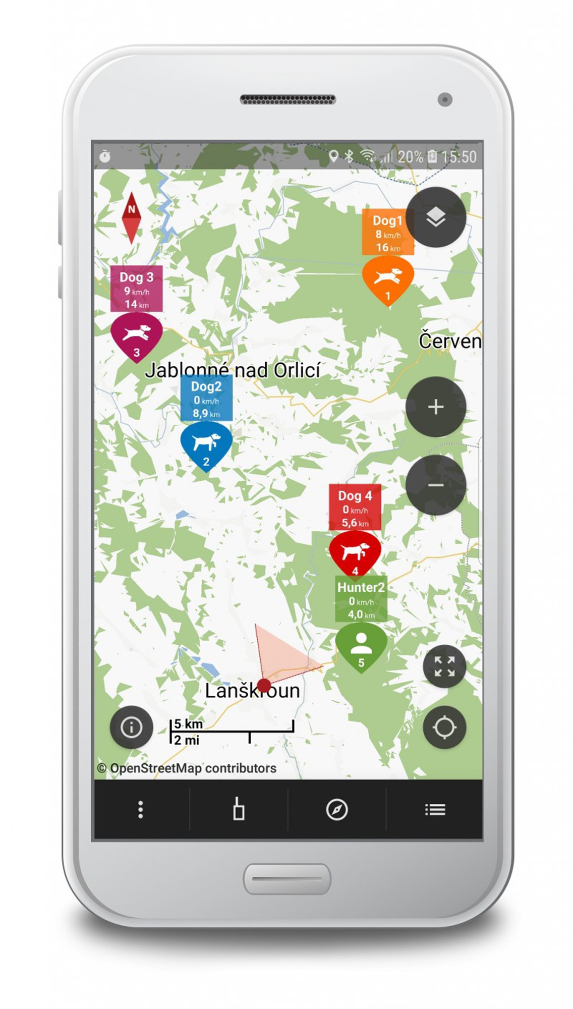 Le suivi peut s’effectuer soit avec le système de boussole intégré dans le boitier orange soit avec l’application sur smartphone ou tablette avec la géolocalisation des éléments recherchés sur une carte (chiens, chasseurs, lieux de destination).