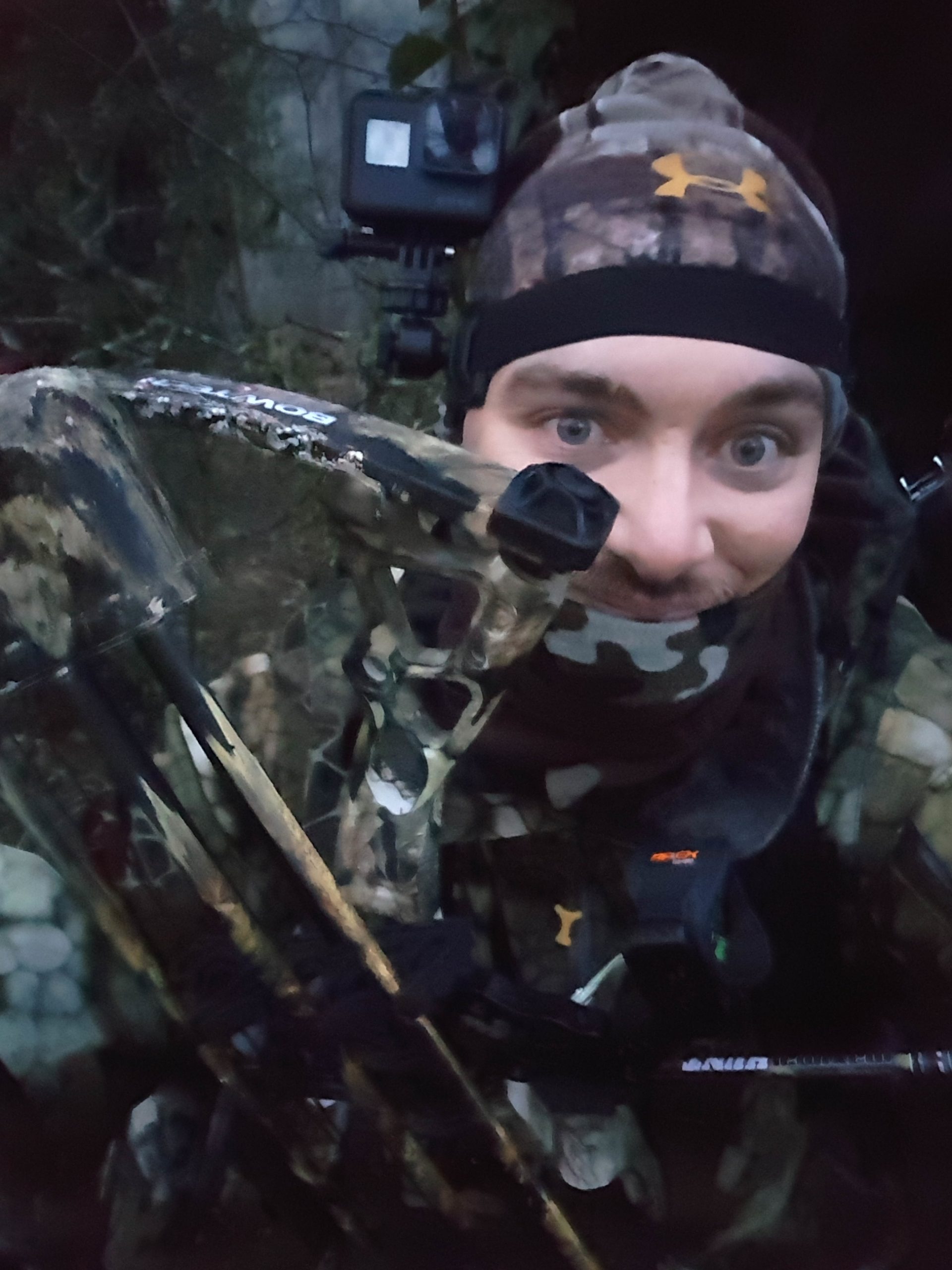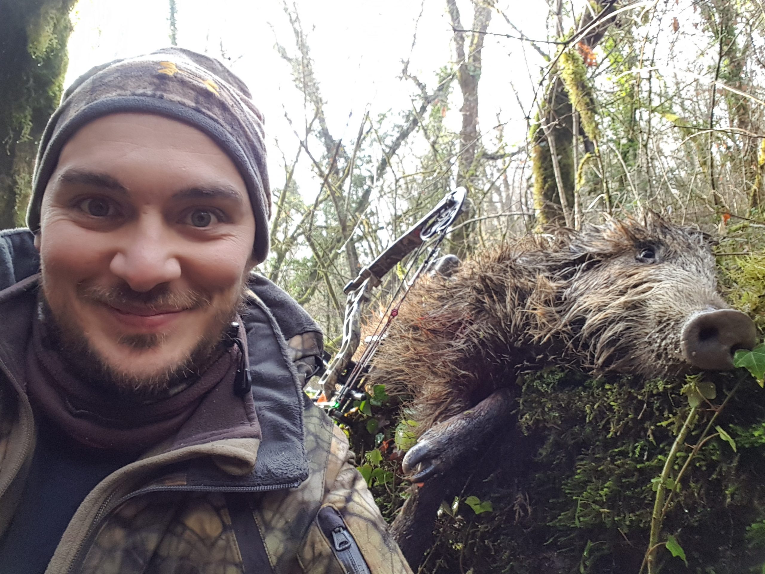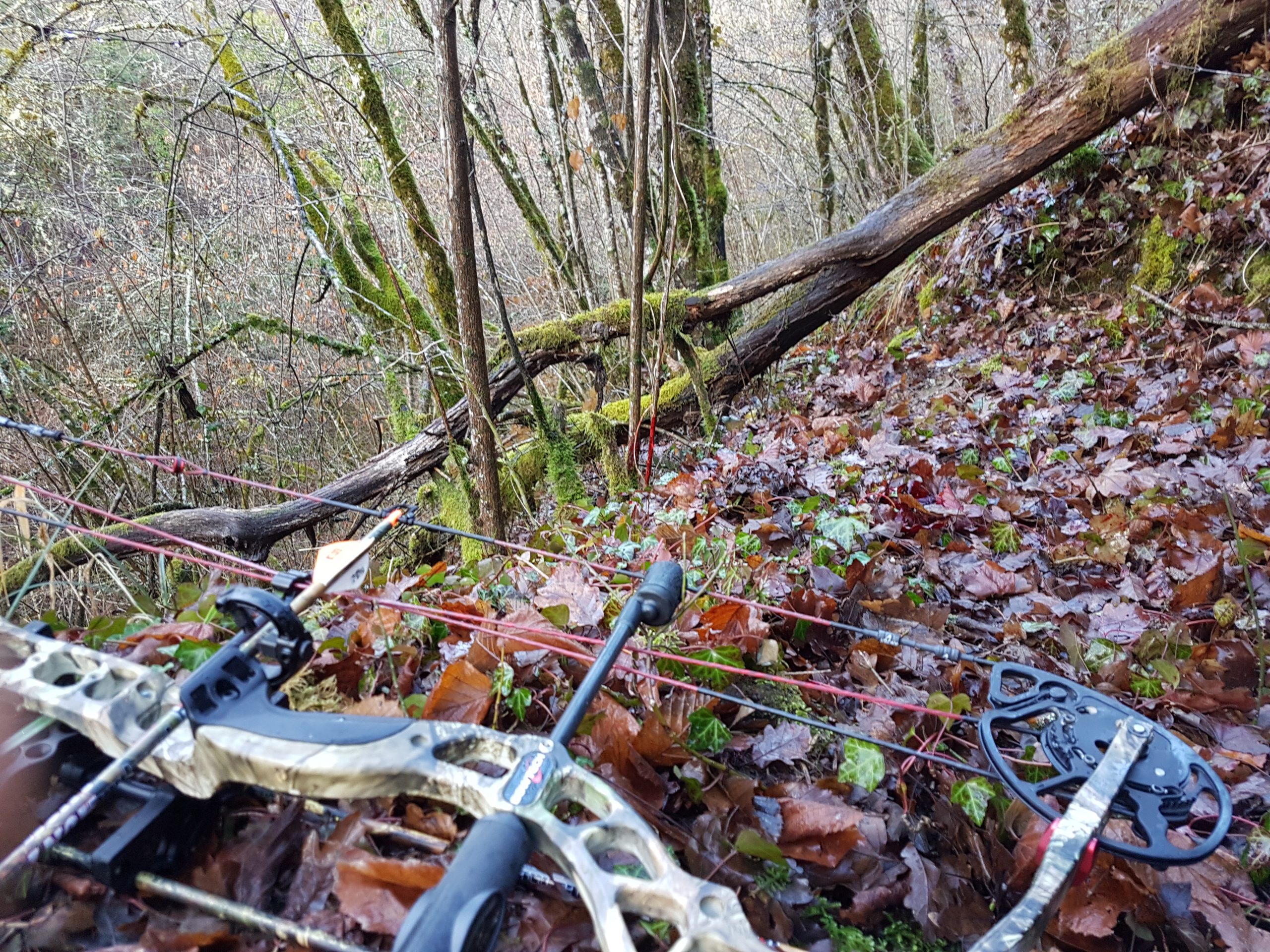 Je suis en place en attendant l’heure légale de tir. Rien, jusqu’à 9h où un geai m’alerte.9h06 une laie suivie de bêtes rousses de 25 kg m’arrive sur la coulée ils sont à 25m. Je commence à armer et j’oublie d’allumer la caméra ce qui fait sauter la flèche en retirant mon décocheur pour l’allumer….