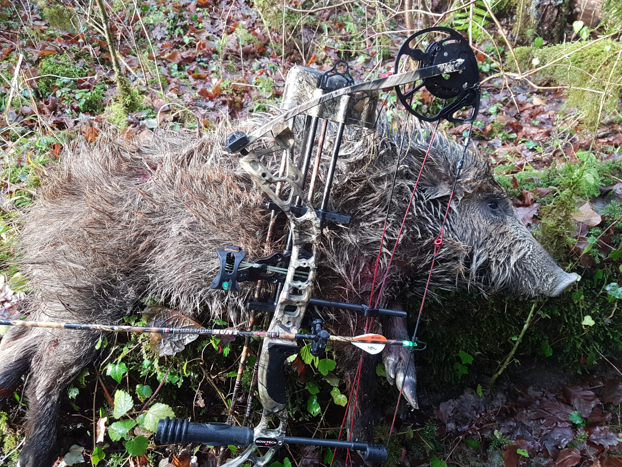 Je décoche et la flèche est au niveau des reins. Le sanglier cri et prends la descente sur les pattes avant.