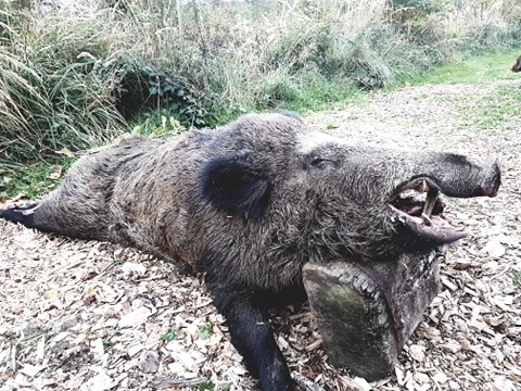 Lorsque j’arrive au poste des ronces se soulèvent devant moi, je me demande alors ce qui se passe. Je mets tout de suite une balle dans mon express de calibre 300 Winchester Magnum et lorsque je referme mon arme le sanglier se dérobe et passe à 4 m de moi. Je lâche une balle en pensant l’avoir raté, l’adrénaline est à son maximum, au final le sanglier ne fera qu’une petite vingtaines de mètres, celui-ci s’étant écroulé d’une balle poumon- cœur.